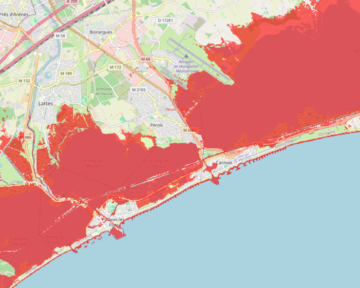 Le rapport donne l’exemple de l’aéroport international de Montpellier Méditerranée, une importante source de recettes fiscales pour les collectivités locales. L’aéroport est limitrophe de l’Étang de l’Or, situé à très faible altitude et donc particulièrement exposé aux conséquences du changement climatique. « Il serait submergé pour moitié dès le scénario d’élévation du niveau de la mer de 50 centimètres ».